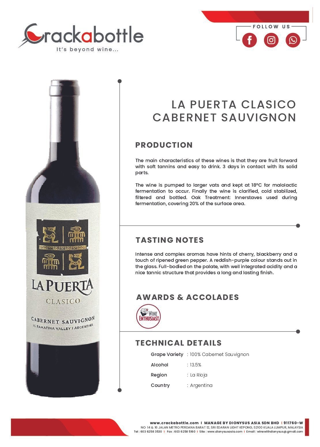 The wine is pumped to larger vats and kept at 18ºC for malolactic fermentation to occur. Finally the wine is clarified, cold stabilized, filtered and bottled. Oak Treatment: Innerstaves used during fermentation, covering 20% of the surface area.